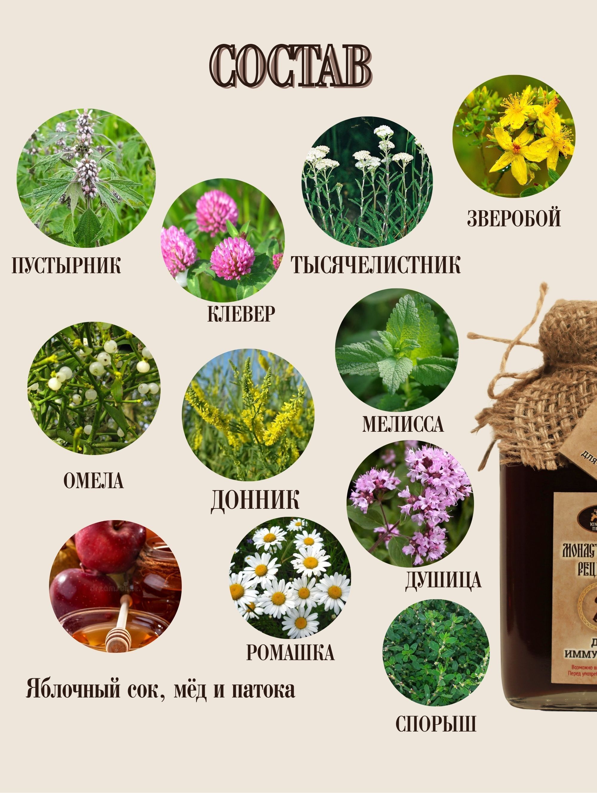 Вода, донник, пустырник, душица, зверобой, мелисса, ромашка, спорыш, тысячелистник, клевер, концентрат яблочного сока, мёд, патока, сахар.